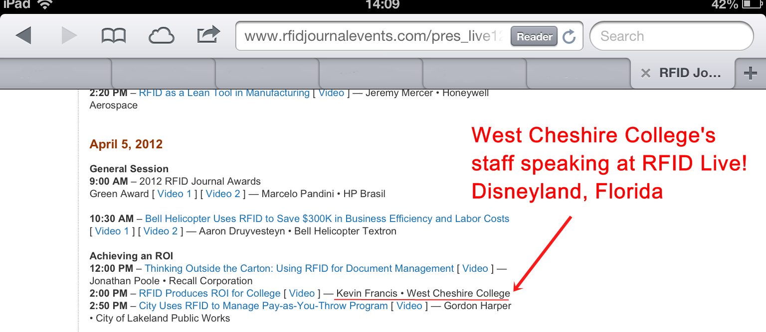 From West Cheshrie College presenting a Return On Investment (ROI) presentation in April 2012 in Florida, to scrapping it in February 2013 it would seem the college has also scrapped all information whatsoever on the groundbreaking industry standard RFID  they have had in the college since 2010.